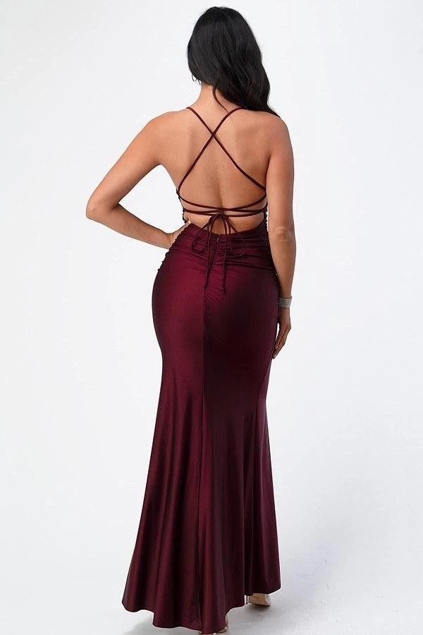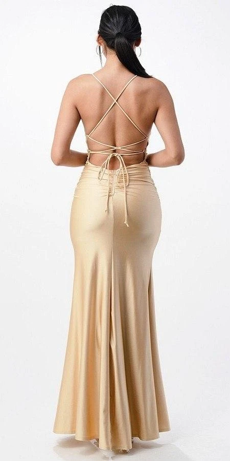 Imagine yourself in this form fitting dress by La Scala 25925. This evening mermaid gown uses spaghetti straps and features a front leg slit and open criss cross tie back. This long mermaid dress is a perfect outfit for red carpet events, pageant, prom or in any other formal occasions!