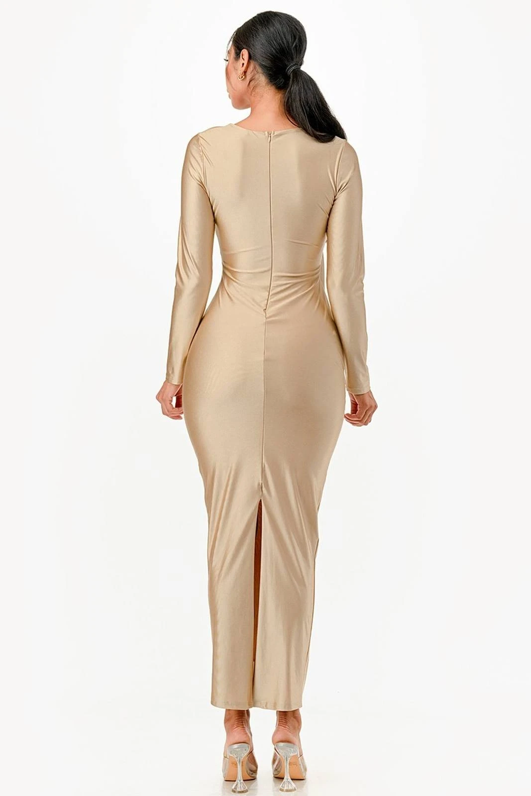 This stunning semi-formal La Scala 26057 maxi dress features shiny tricot material, a fitted silhouette with a V-neckline and long sleeves. It features a back slit add a touch of elegance. Perfect for any special occasion, this dress is sure to catch everyone’s eye.