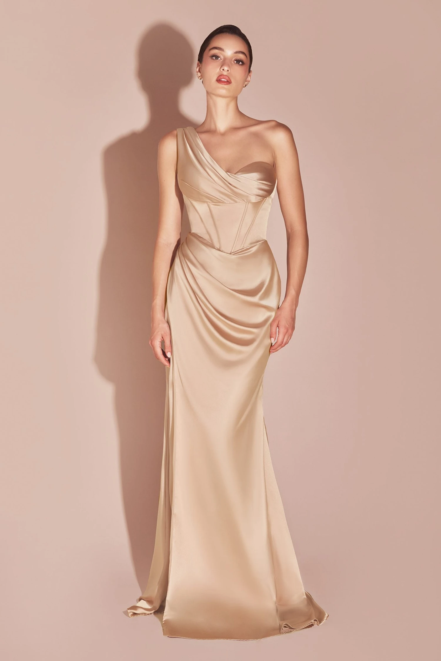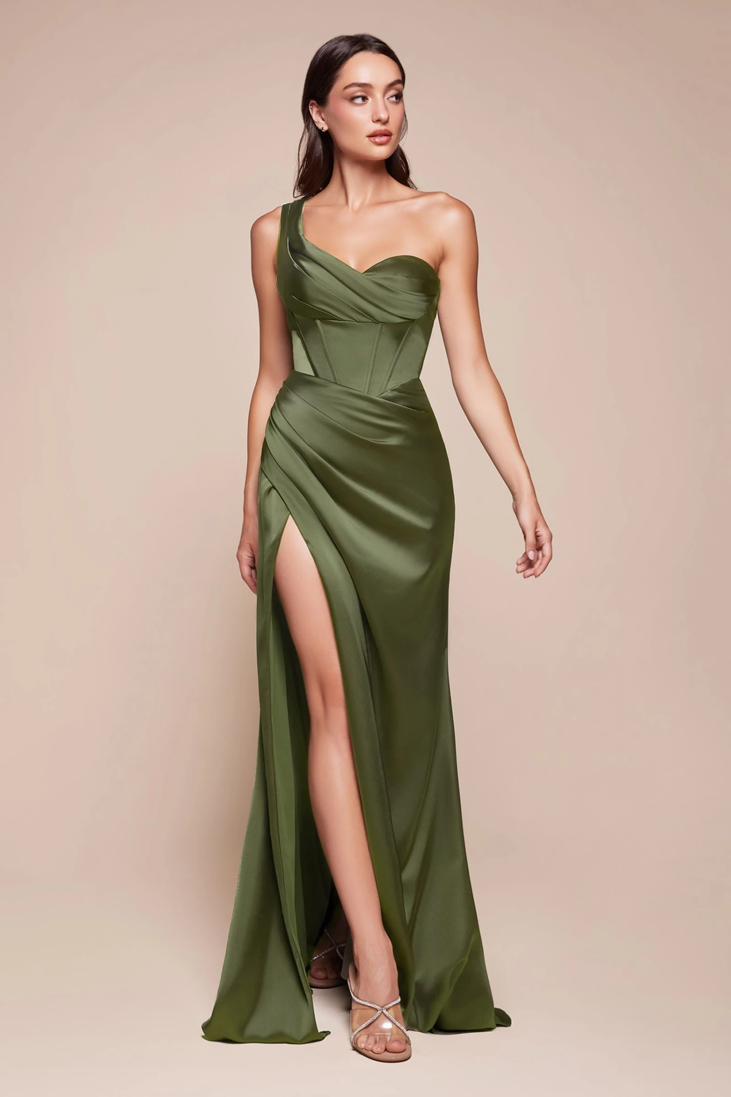 This long-fitted gown by Ladivine 7448 showcases a one-shoulder pleated neckline with a gathered waistline and a leg slit, offering a touch of modern elegance. Made from luxe satin, the structured boned bodice provides a flattering fit, while the center back zipper ensures a sleek finish. Perfect for bridesmaids, wedding guests, or formal events, this dress is a sophisticated choice for any special occasion.