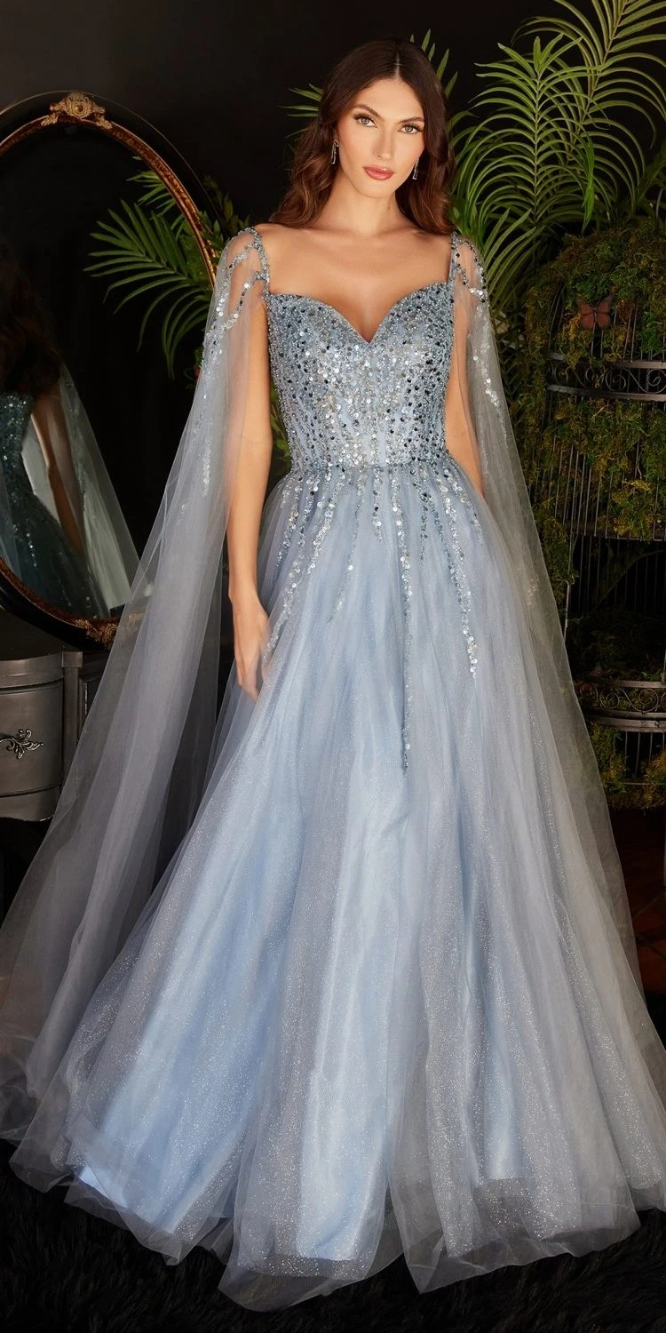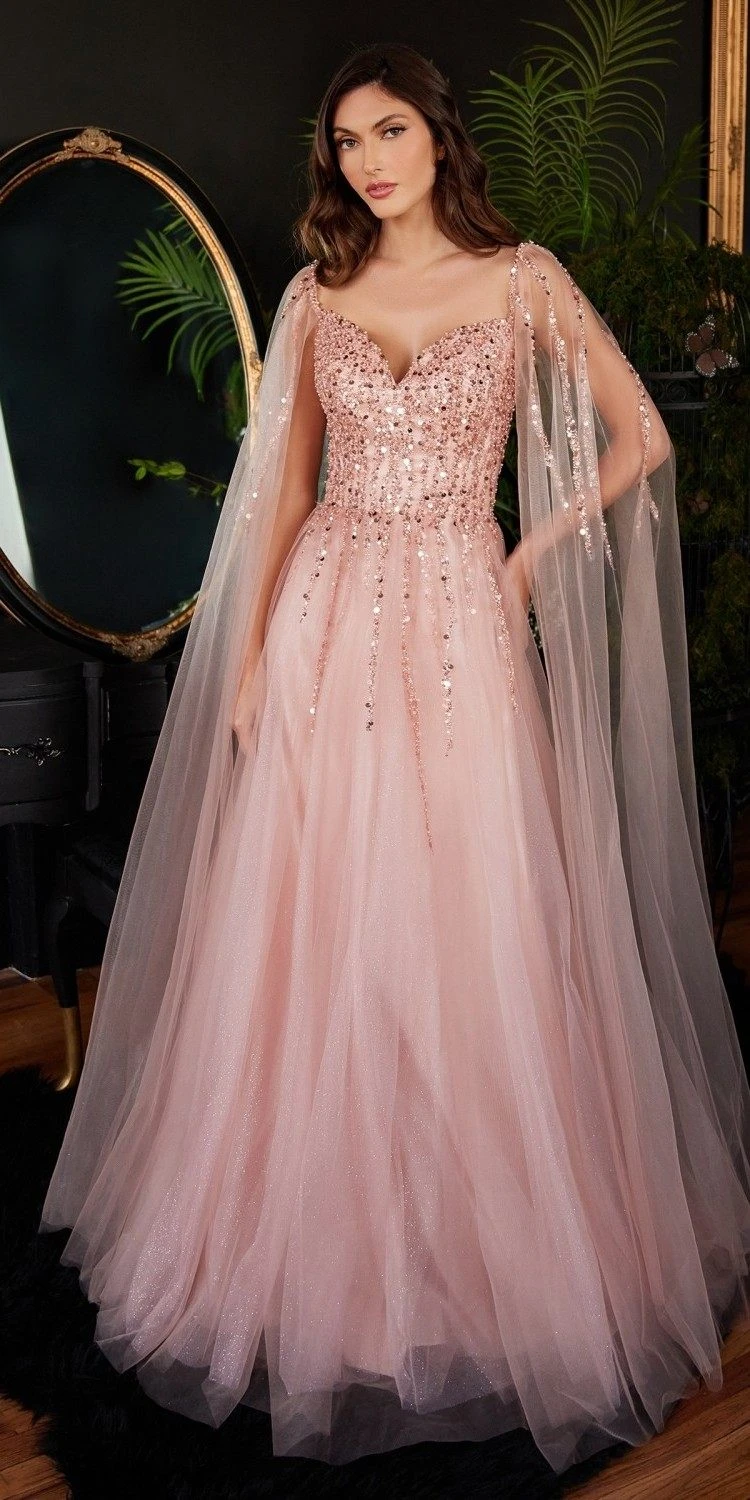 Imagine yourself in this beautiful floor length A-line evening gown for your next formal event. This sweetheart neckline formal dress by Ladvine CD0204 can be worn either as off the shoulder or over the shoulder. This dress features cape sleeves that drape down to the floor and is embellished with sparkly beads and sequins. An ideal full-length dress for red carpet events, pageant, prom or in any other formal occasions!