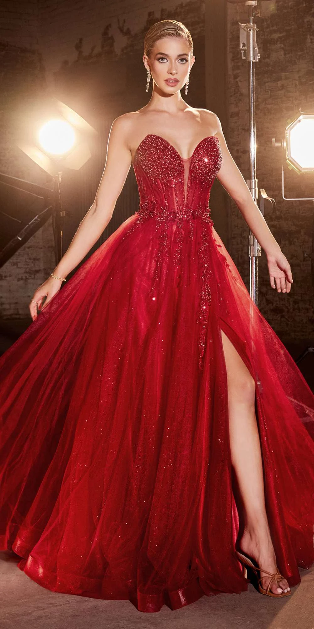 Look stunning in this Ladivine CD0230 formal A-line gown. This fitted long floor length dress showcases an eye-catching plunging sweetheart neckline, a beaded embellished bodice, and a hint of sparkle. The layered glitter tulle skirt, strapless sheer boned bodice, and leg slit lend elegance and glamour to your look. The sweep train adds the perfect finishing touch.Â