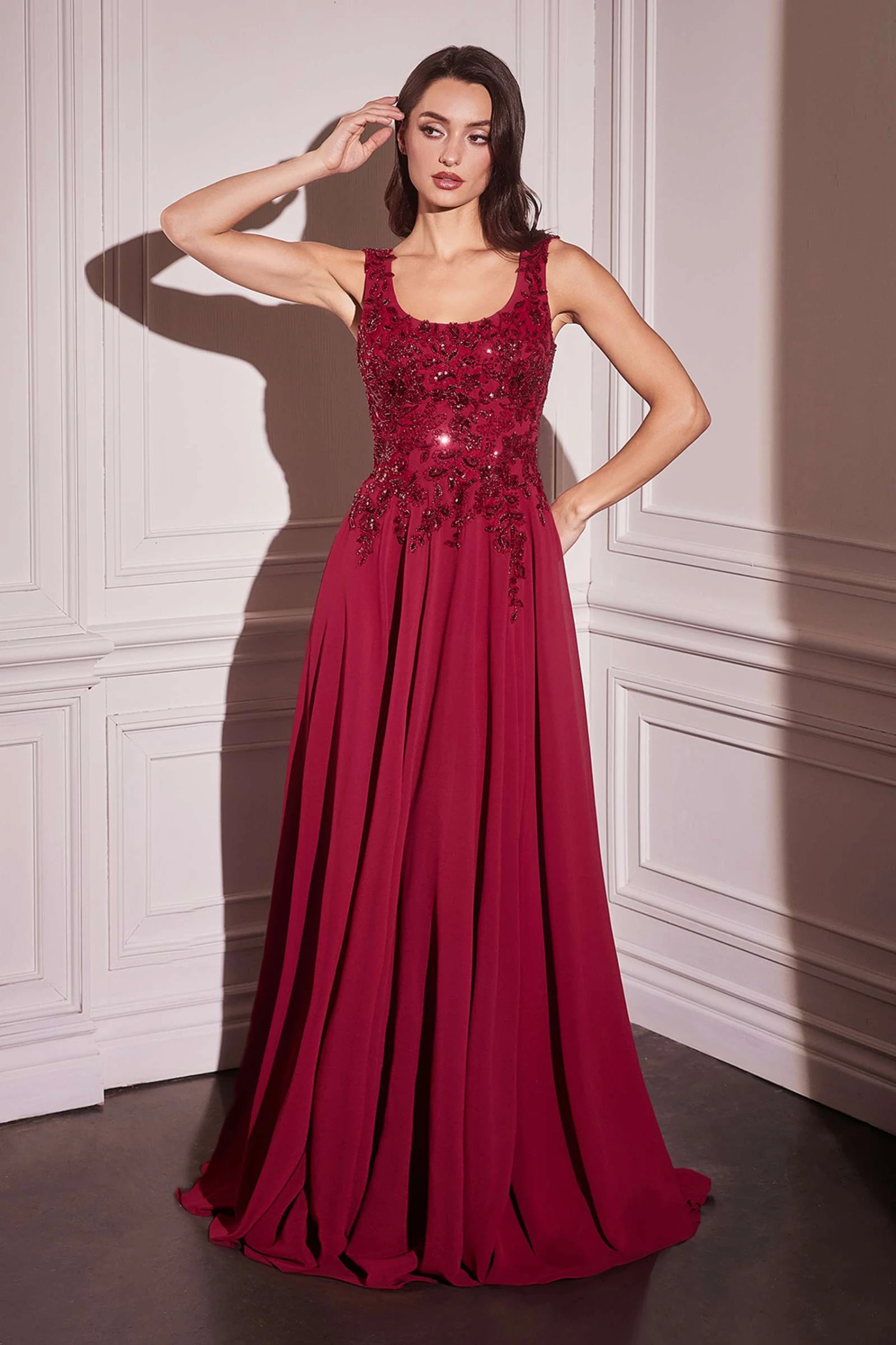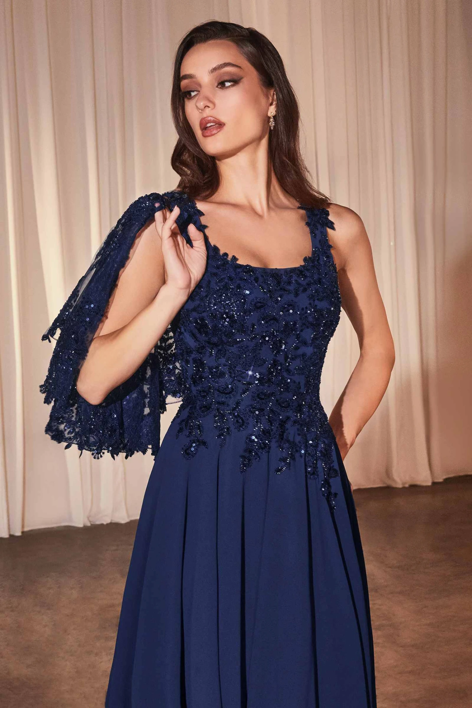 Elevate your elegance with our A-line chiffon dress by Ladivine CDS503, designed for the sophisticated mature woman. The exquisite, beaded lace bodice, adorned with sleeveless straps and a graceful scoop neckline, offers a perfect blend of refinement and allure. The flowing chiffon skirt creates a timeless A-line silhouette that flatters every figure. Adding a touch of versatility and charm, the dress includes a sheer matching lace beaded cape that drapes beautifully around the shoulders and can be removed for a different look. Ideal for weddings, evening events, or any special occasion, this gown ensures you will shine with timeless sophistication and grace. Make a lasting impression in this enchanting ensemble, perfect for celebrating lifes most precious moments.