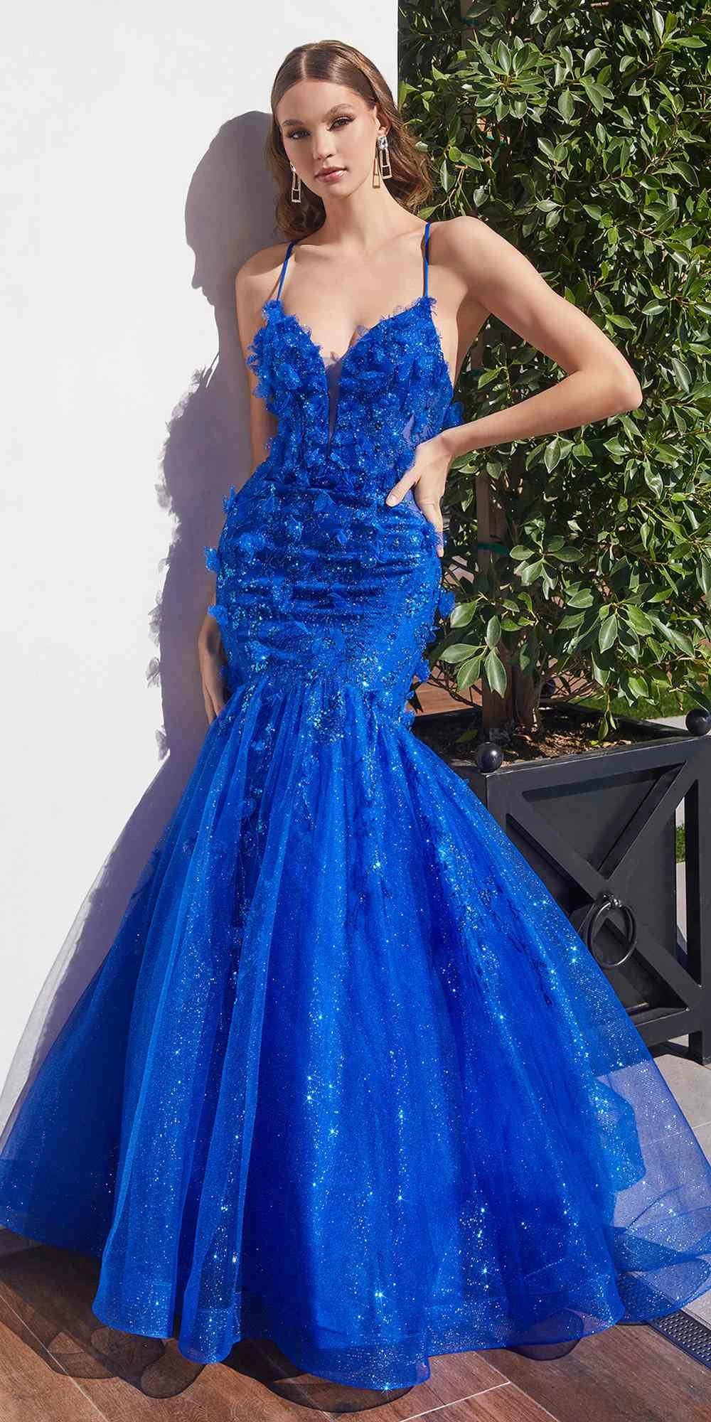 Imagine yourself in this beautiful floor length evening gown for your next formal event by Ladivine CM328. There’s nothing more romantic or captivating than wearing a classic mermaid gown with a modern twist. Our floral applique mermaid gown is designed to be sexy, modern and show-stopping. Perfect for prom night, this gown features a deep v-neckline with glitter print and intricate floral applique that is sure to turn heads as you make your grand entrance. Layer upon layer of soft tulle create an unforgettable mermaid tail silhouette that makes the perfect finishing touch. The corset back provides a secure fit while exuding an additional layer of seductiveness. With our floral applique mermaid gown you can make an unforgettable statement at any event. An ideal full-length dress for red carpet events, pageant, prom or in any other formal occasions!
