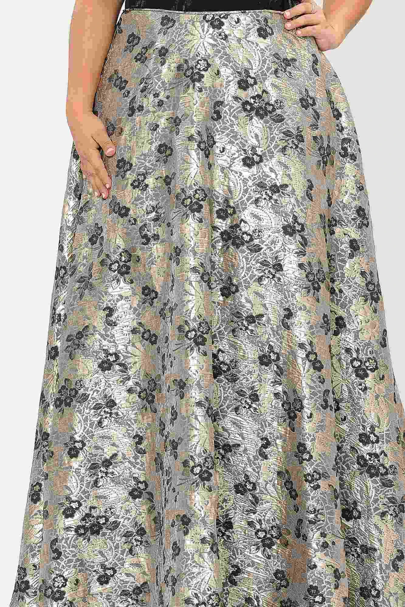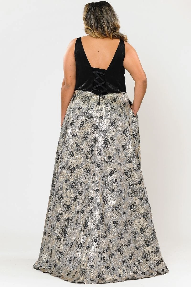 Imagine yourself wearing this beautiful floor length A-line jacquard plus size dress by Lindas W1012. This long, A-line dress features a V-neckline with sheer insert, side pockets, black satin top, printed skirt and lace up tie back. An ideal full-length dress for prom, special occasion, party or in any other formal occasions!