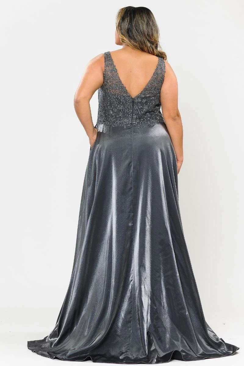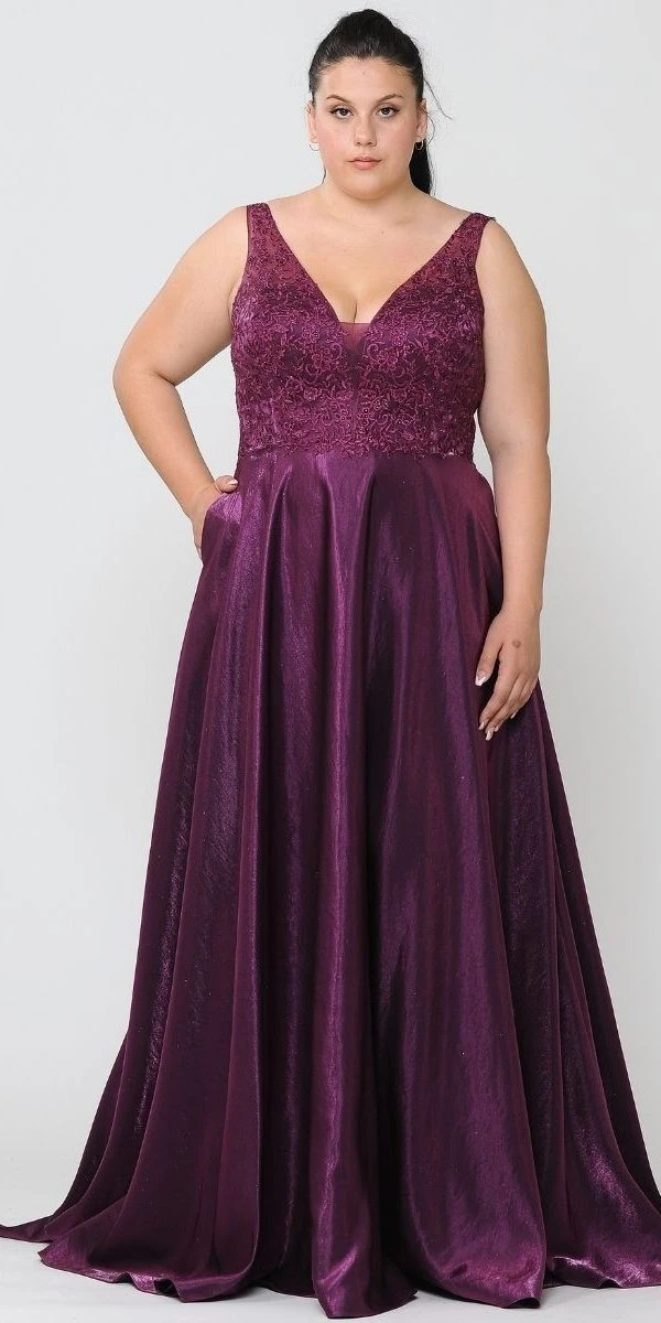 Imagine yourself wearing this beautiful floor length A-line shimmer plus size dress by Lindas W1032. This long, A-line dress features a V-neckline with sheer insert, embroidered top and side pockets. An ideal full-length dress for prom, special occasion, party or in any other formal occasions!