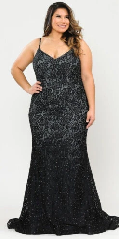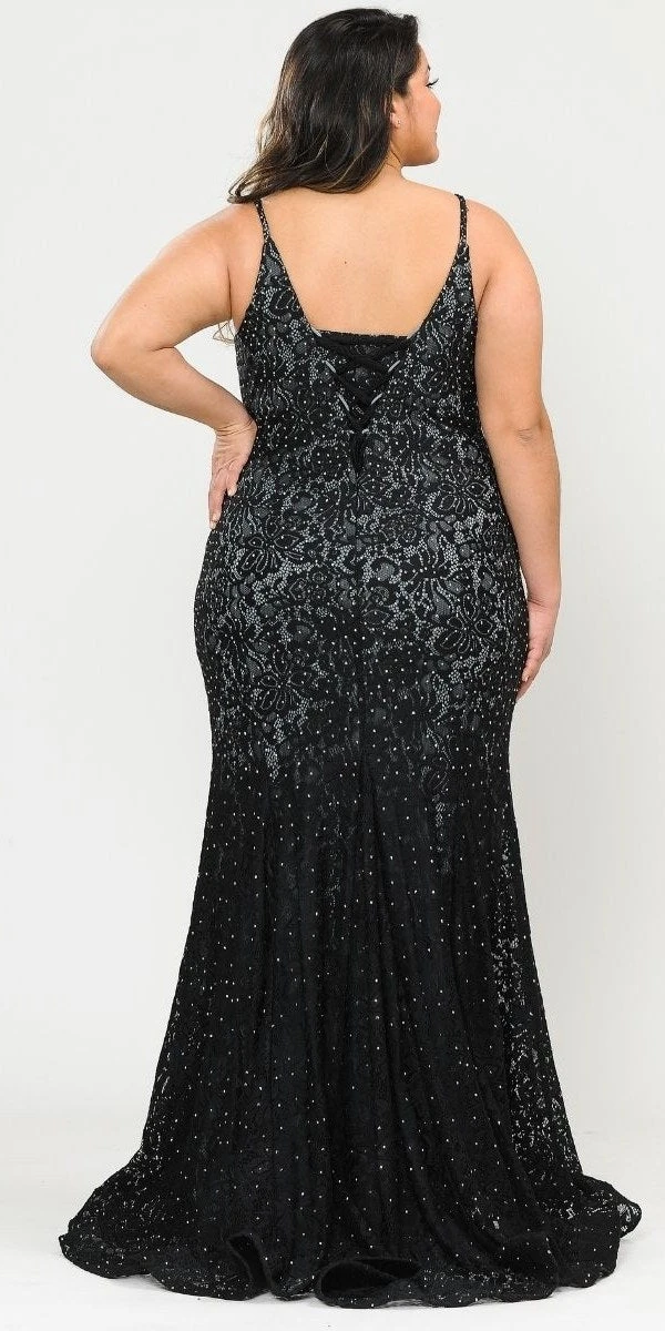 Imagine yourself wearing this beautiful floor length stretch lace plus size dress by Lindas W1090. This long fitted dress is supported by thin spaghetti straps and features a V-neckline, rhinestones embellished throughout, and a corset lace up tie back. An ideal full-length dress for prom, special occasion, party or in any other formal occasions!