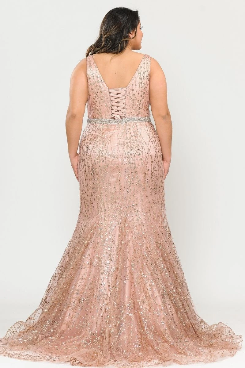 Imagine yourself wearing this beautiful floor length glitter mesh plus size dress by Lindas W1092. This long mermaid dress features a deep V-neckline with sheer insert panel, rhinestones embellished around the waistline and a corset lace up tie back. An ideal full-length dress for prom, special occasion, party or in any other formal occasions!