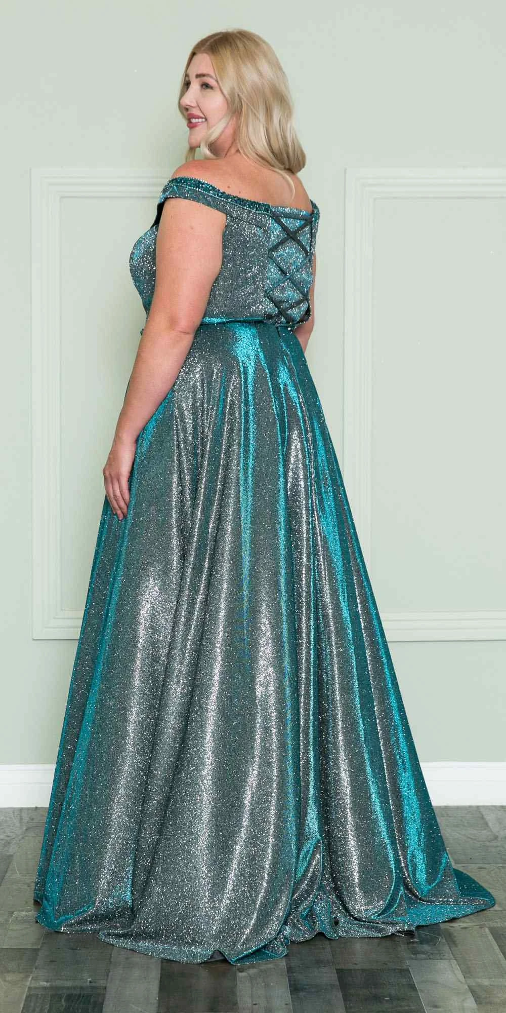 Imagine yourself wearing this beautiful floor length glitter knit plus size dress by Lindas W1096. This long A-line dress features an off the shoulder strap with an embellished neckline and waistline, side pockets and a corset lace up tie back. An ideal full-length dress for prom, special occasion, party or in any other formal occasions!