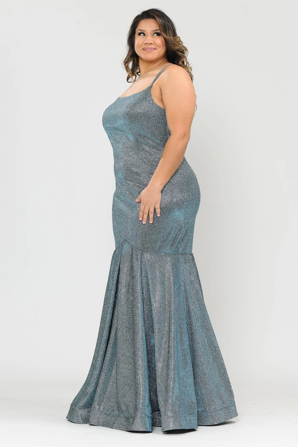 Imagine yourself wearing this beautiful floor length glitter knit plus size dress by Lindas W1102. This long mermaid dress features a square neckline, double spaghetti straps and a corset lace up tie back. An ideal full-length dress for prom, special occasion, party or in any other formal occasions!
