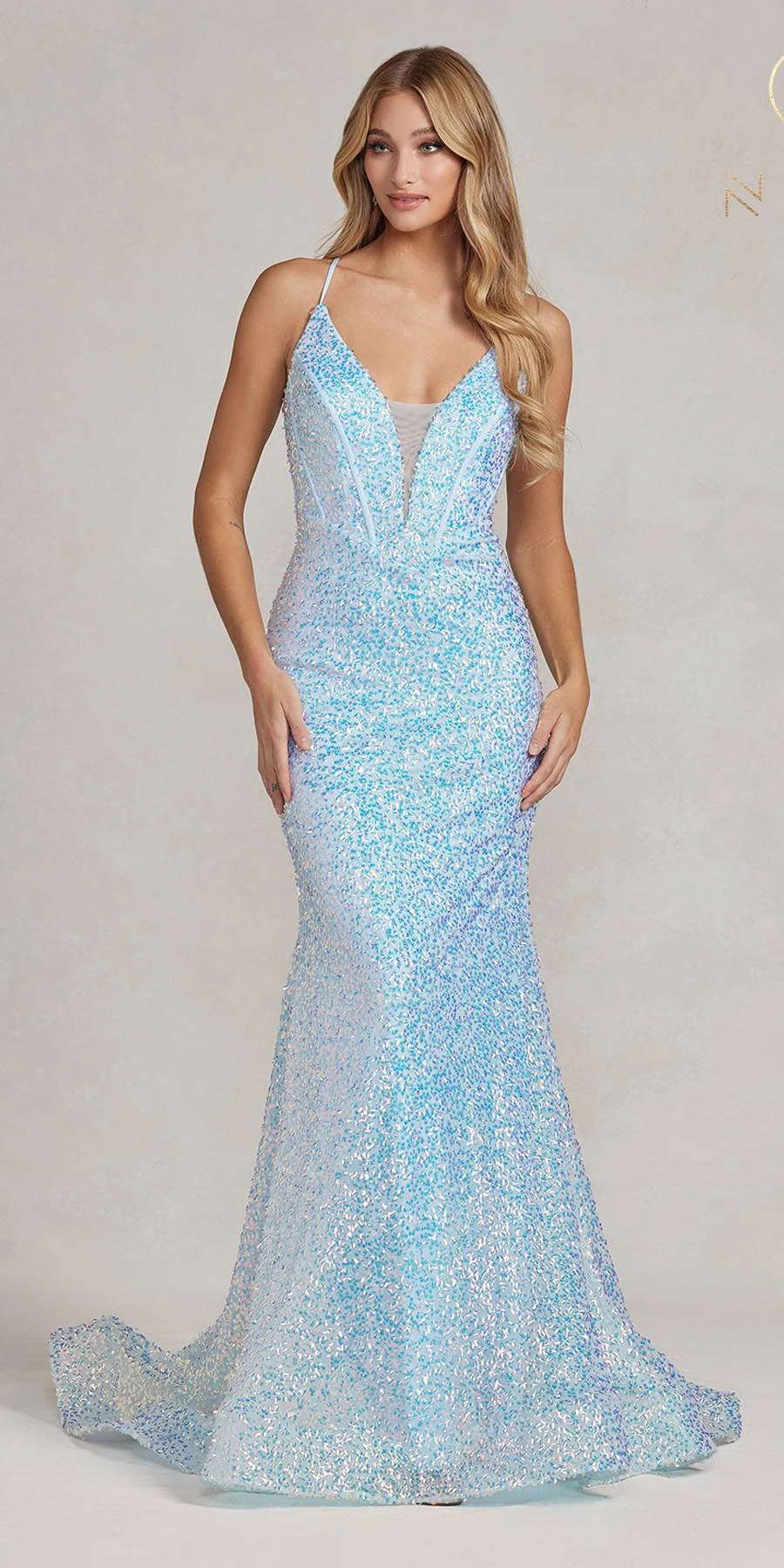 Imagine yourself wearing this floor length formal mermaid gown for your next special event by Nox Anabel C1094. This long dress has a plunging V-neckline with a sheer insert panel, spaghetti straps and a crisscross back with a corset lace up back. An ideal full-length dress for black tie, red carpet, prom or in any other formal occasions!