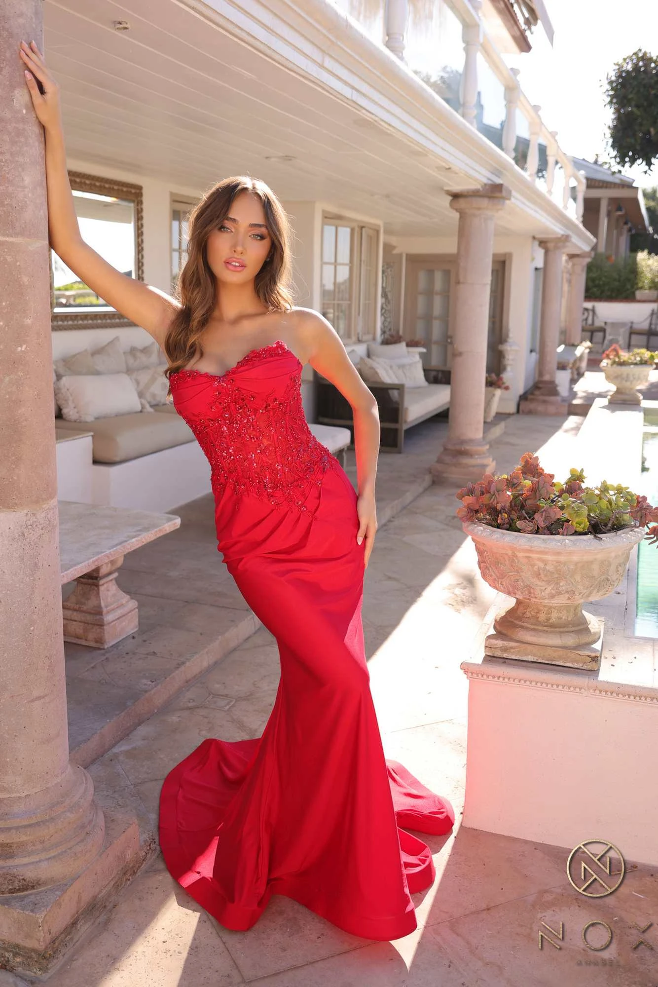 This formal dress by Nox Anabel C1345 is an eye-catching and glamorous design, featuring a fitted, mermaid silhouette and a stunning satin fabric. The sleeveless, strapless sweetheart neckline and beaded lace applique boned corset bodice add a touch of elegance, while the sweep train and floor length design make it a vision of beauty. A perfect showcase for any special occasion, this dress is guaranteed to turn heads and make a lasting impression. An ideal full-length dress for black tie, red carpet, prom or in any other formal occasions!