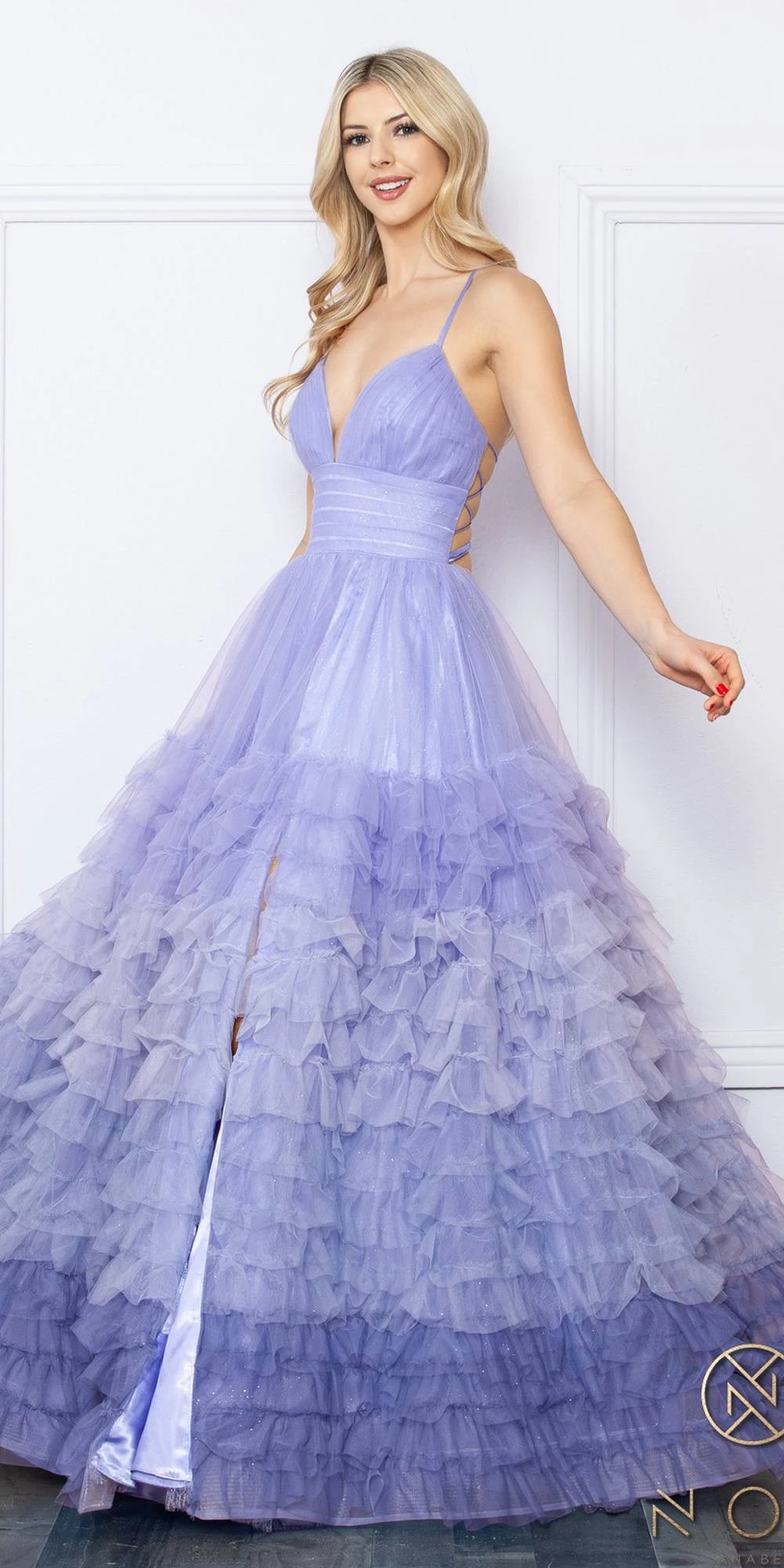The ethereal timeless A-line ball gown by Nox Anabel C1420 will make you dance the night away at your next formal event. With ruched detailing and a floor length sweep train, this dress features a V-neckline, thin spaghetti straps, and a refreshing open strappy crisscross back. The ombre tiered ruffled skirt adds a touch of magic, while the leg slit adds a touch of allure. An ideal full-length dress for black tie, red carpet, prom or in any other formal occasions!