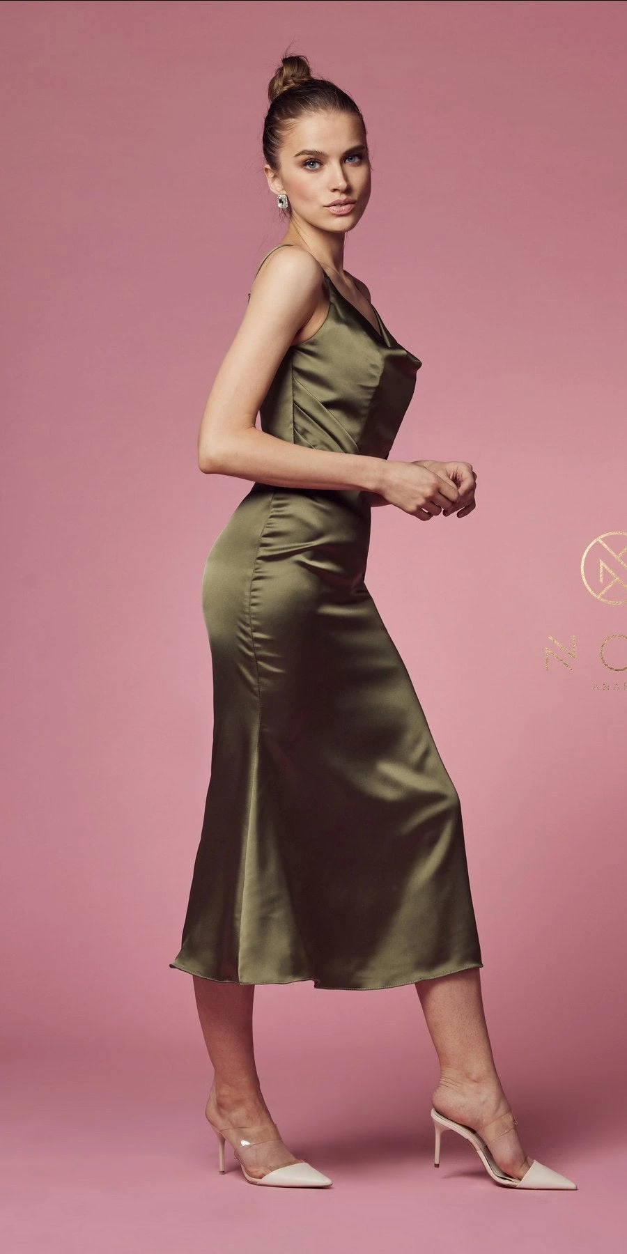 Imagine yourself wearing this beautiful tea length fitted sheath mermaid gown for your next formal event. This tea midi-length formal dress by Nox Anabel R1027 features a cowl neckline with spaghetti straps and pleated sides. An ideal mid length dress for red carpet events, pageant, prom or in any other formal occasions!
