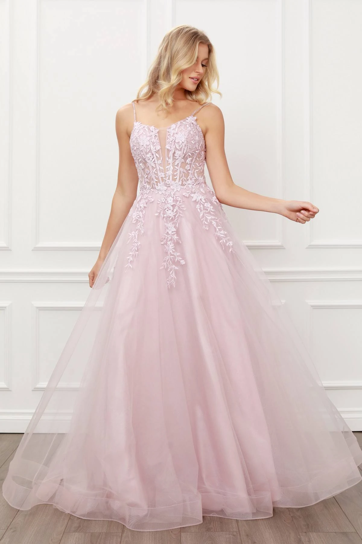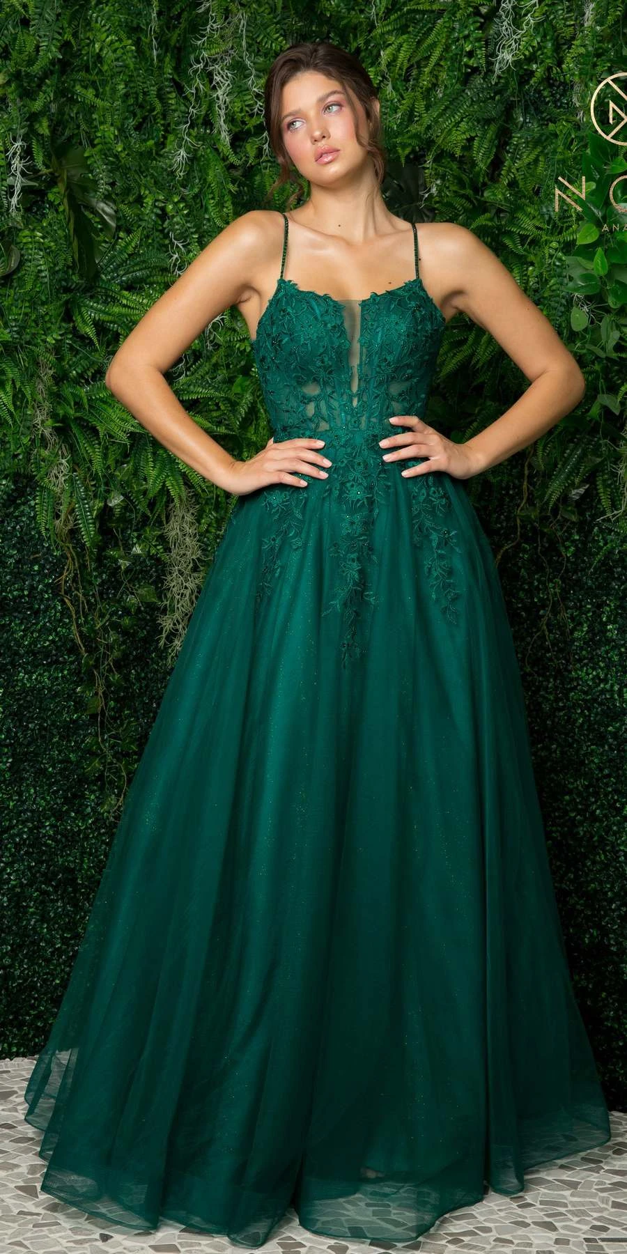 Imagine yourself wearing this beautiful floor length A-line gown for your next formal event. This long sleeveless evening dress by Nox Anabel T449 makes a statement with its soft and romantic design! Featuring slight floral embellished beads that branches neck to waist, this gown’s bodice is highlighted by the scoop neck plunge V-shape. Spaghetti straps come up from the bodice and are accentuated on both sides by chiffon layers on the gown adding a completely-boho touch. The back of this gown features a deep V-back, allowing crisscross straps to stand out truly. Its A-line gown completely sheer detailing of long layers of organza. An ideal full length dress for red carpet events, pageant, prom or in any other formal occasions!