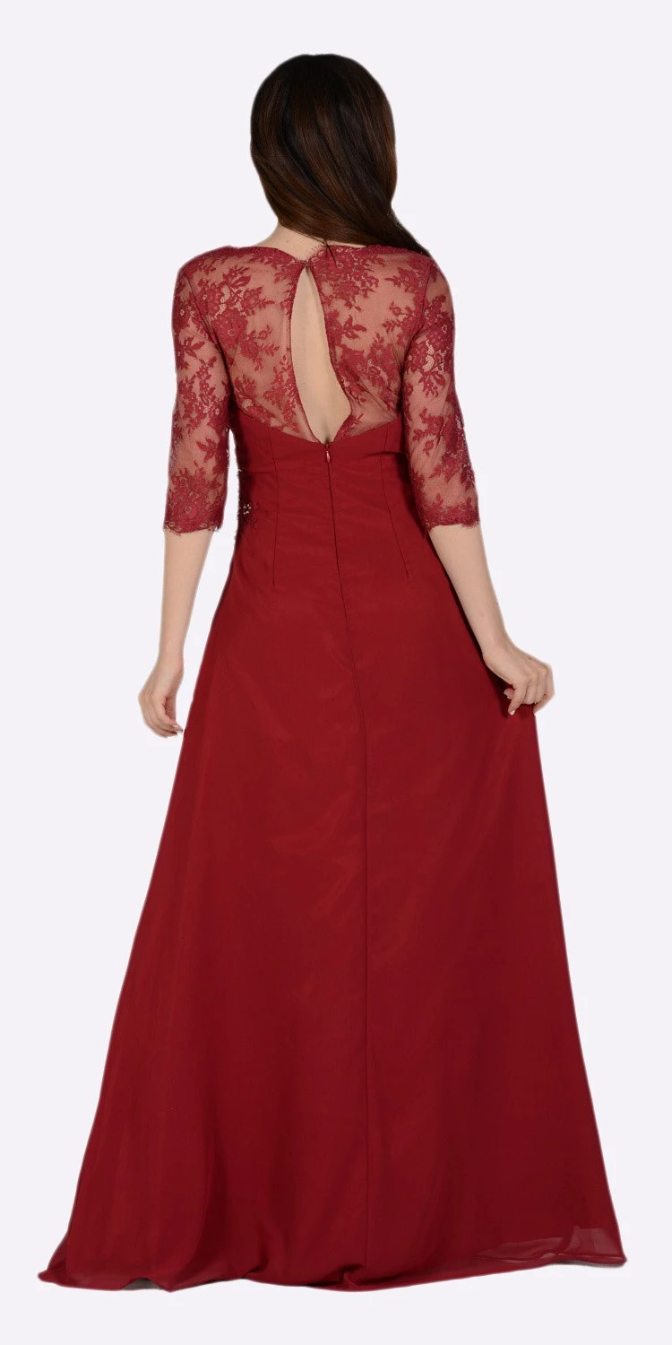 Full length long chiffon and lace dress with ruched bodice and waistline adorned with beads and rhinestones. Mid length lace sleeves. Back closure shows off eye design.