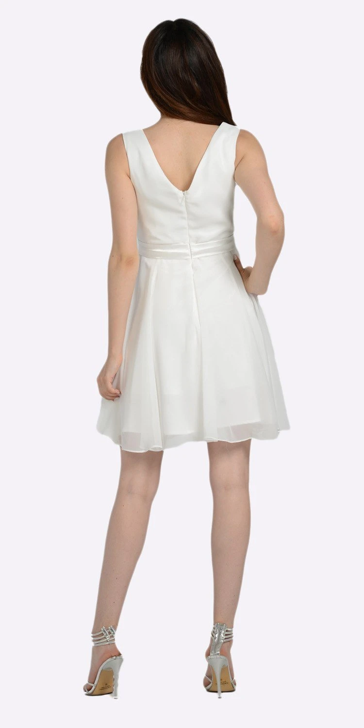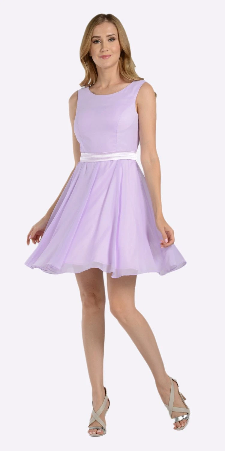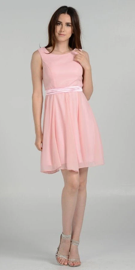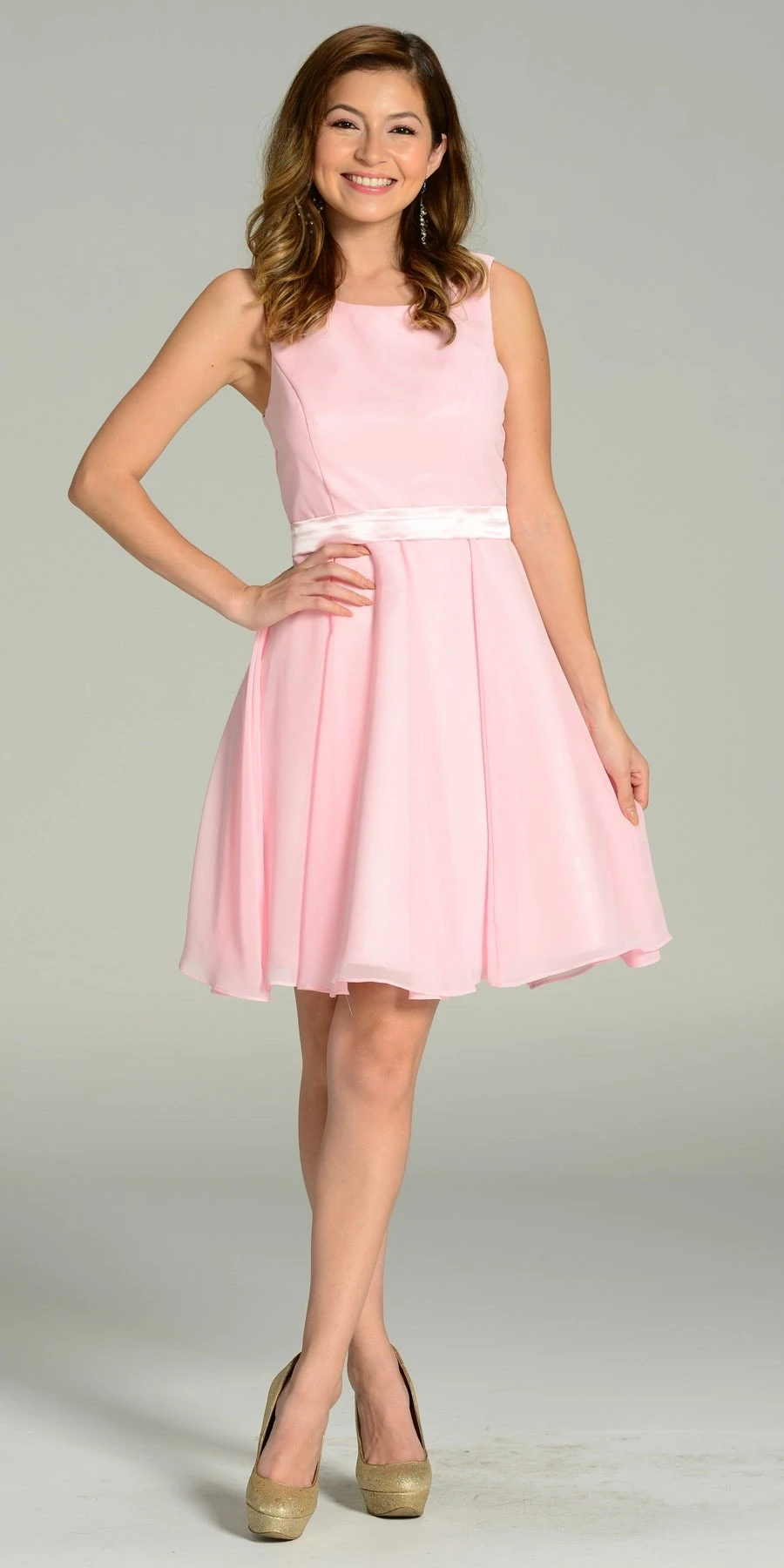 Cute knee length sleeveless short chiffon dress in royal-blue with satin waistline. Wide tank straps. Sleeveless. Modest neckline. Back zipper closure.