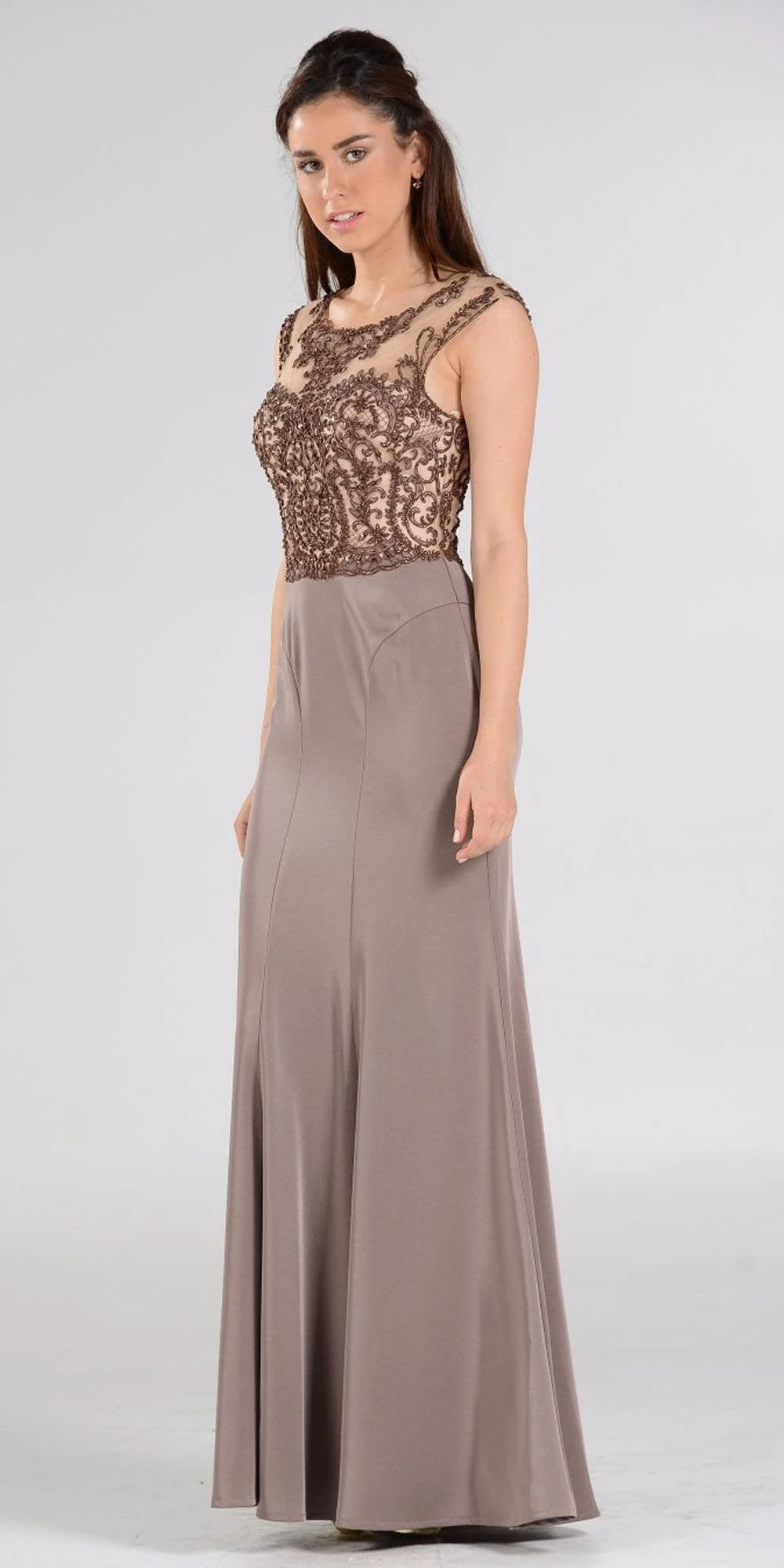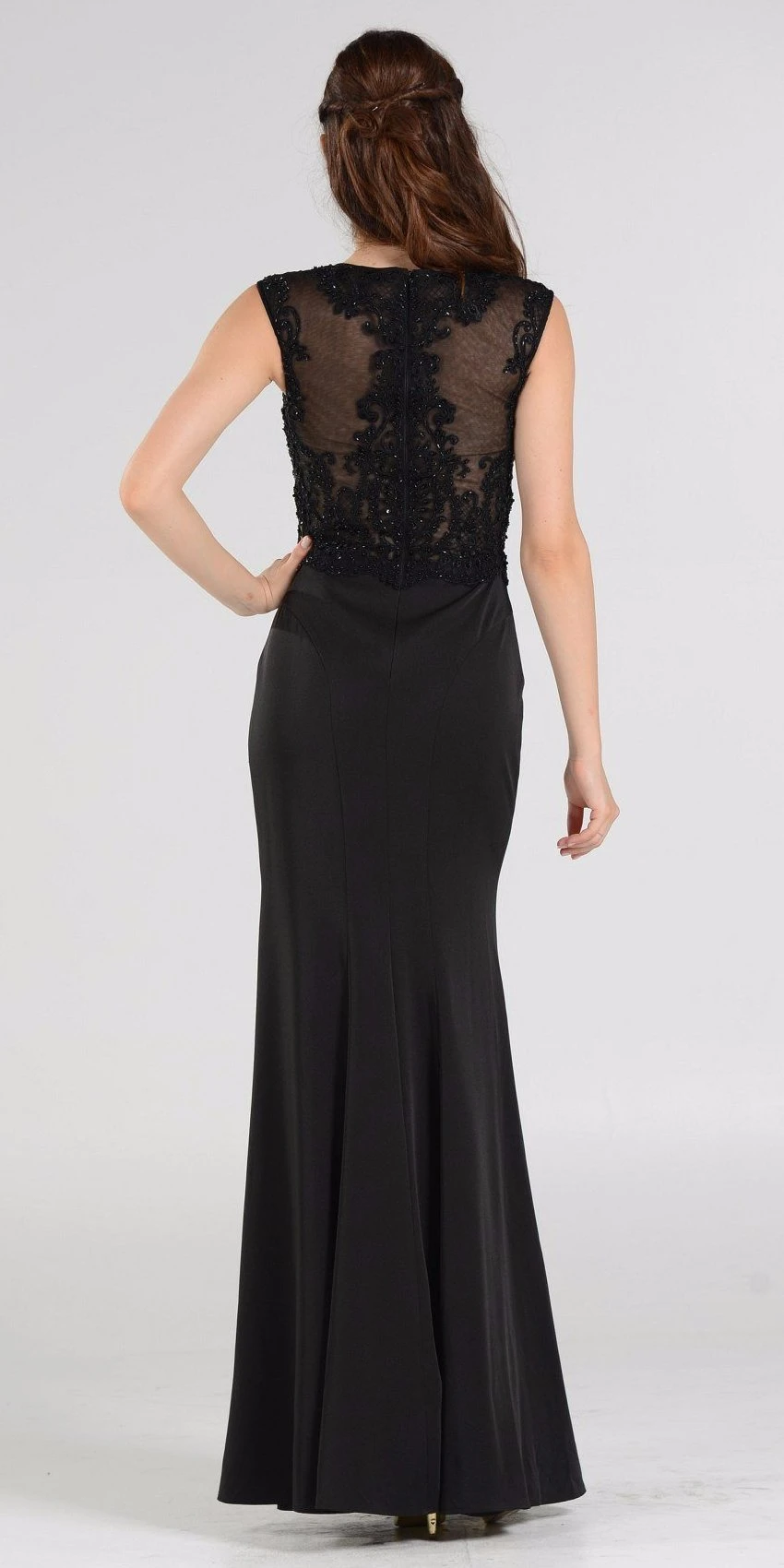 Scoop neck, cap sleeves, embroidered bodice adorned with beading. This fit and flare long dress in span satin skirt is perfect for outfit for prom!