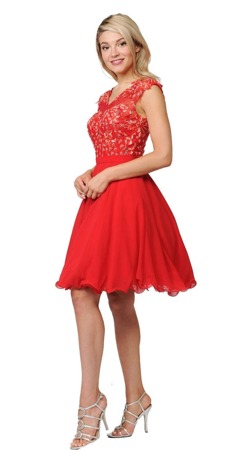 Dress up on your next special occasion with this beautiful a-line homecoming short dress by Poly USA | Ed Young 8094 in blush. A lovely chiffon short dress with illusion v-neckline, cap sleeves and a bodice embellishes with appliques.