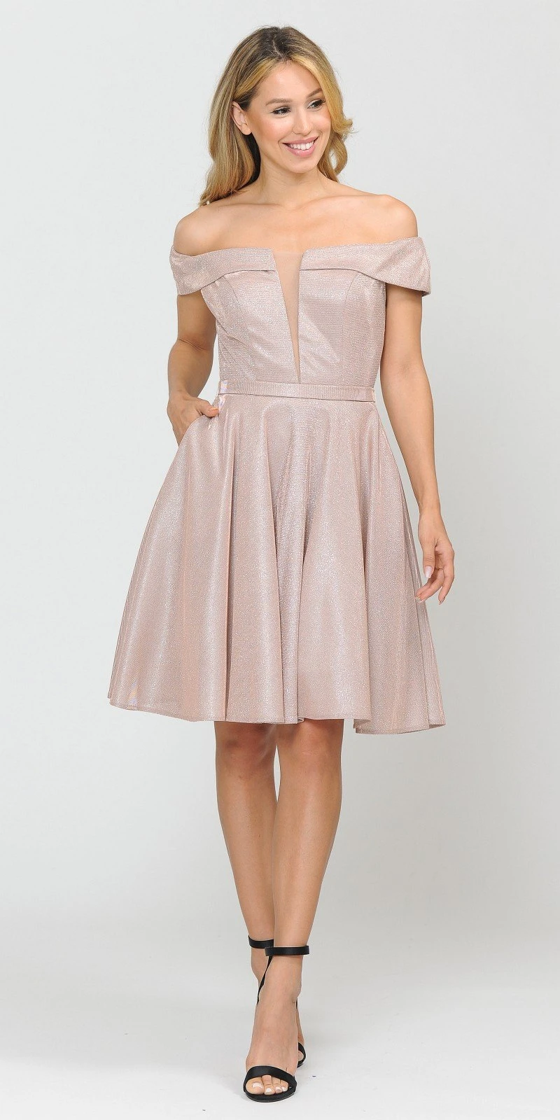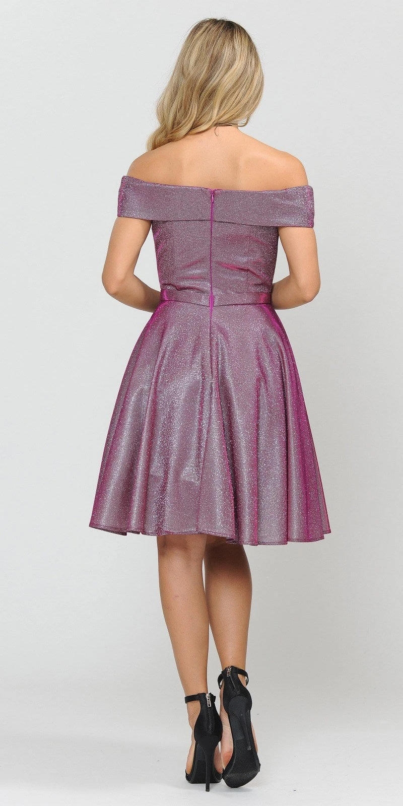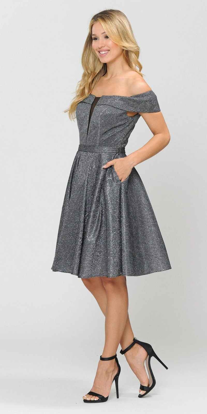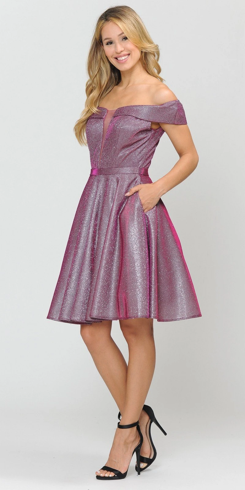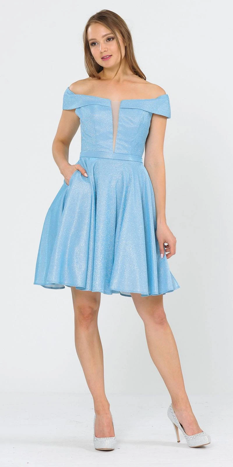 Enjoy the celebration with this short party dress made of shimmering glitter knit fabric by Poly USA | Ed Young 8224 in baby blue. This short cocktail dress features a sheer-inset bodice, fold-over off-shoulder neckline, accented with band that wraps around the natural waist and added with pockets. A gorgeous dress for homecoming, parties or any special occasion.