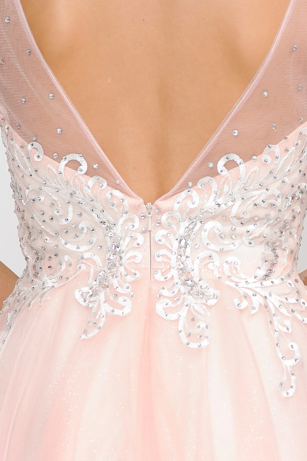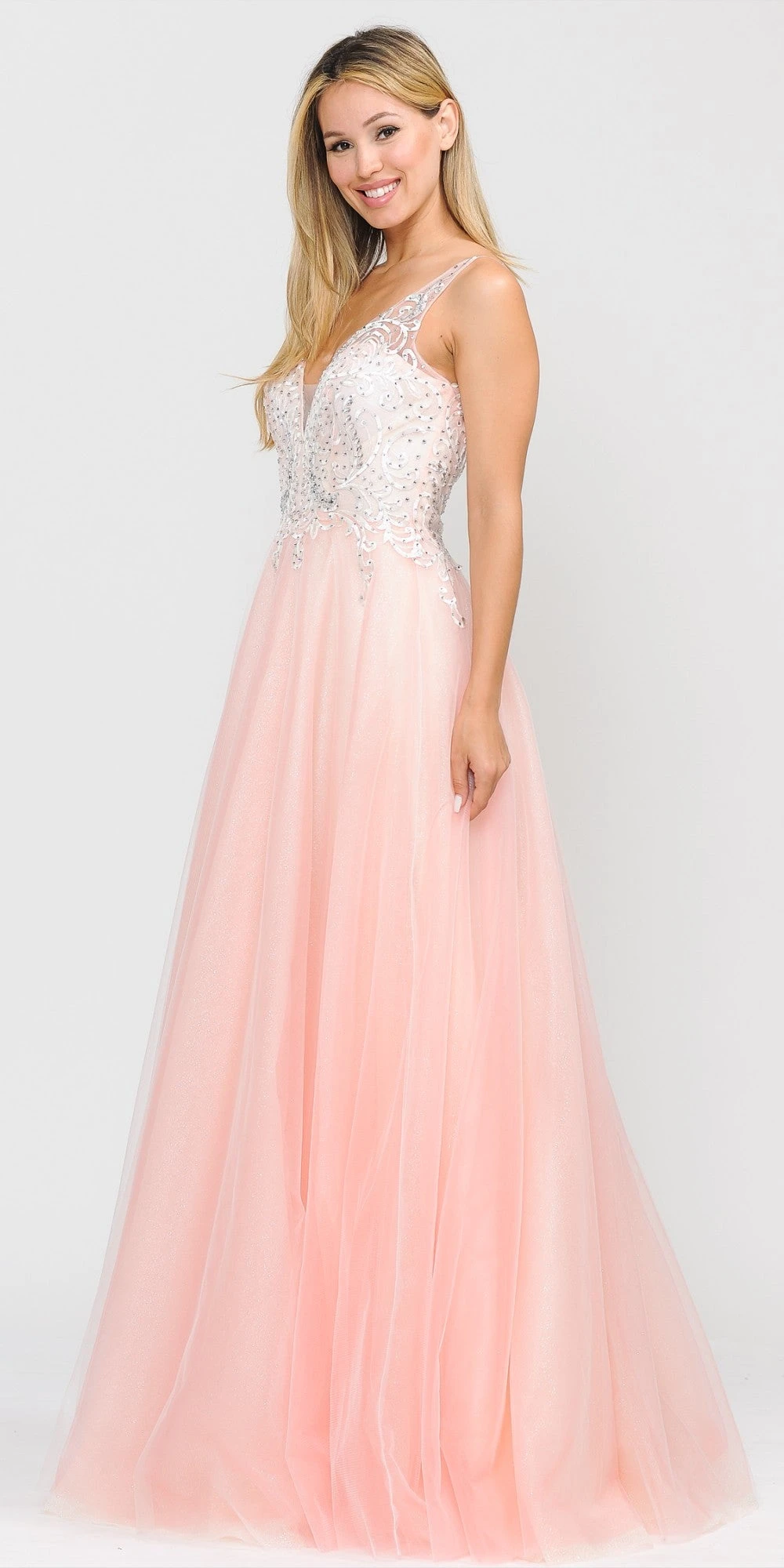 Imagine yourself wearing this beautiful long A-line formal dress by Poly USA | Ed Young 8354. This sleeveless floor length glitter dress has a V-neckline with sheer insert panel and features a rhinestone embellished bodice and V-back. An ideal full-length dress for prom, awards ceremony or any other formal occasions.