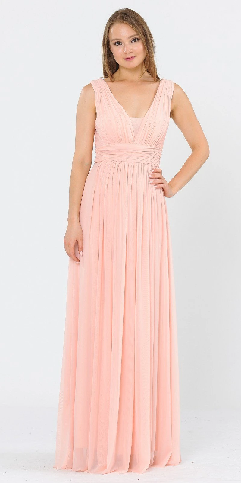 This gorgeous a-line silhouette long formal dress in blush is ideal for wedding guests, bridesmaids and in any other formal occasions! This made of soft chiffon fabric dress features a ruched bodice with deep v-neck and back, accented with wide band that emphasize the natural waist. This sleeveless gown by Poly USA | Ed Young 8408 in blush is also available for plus sizes!