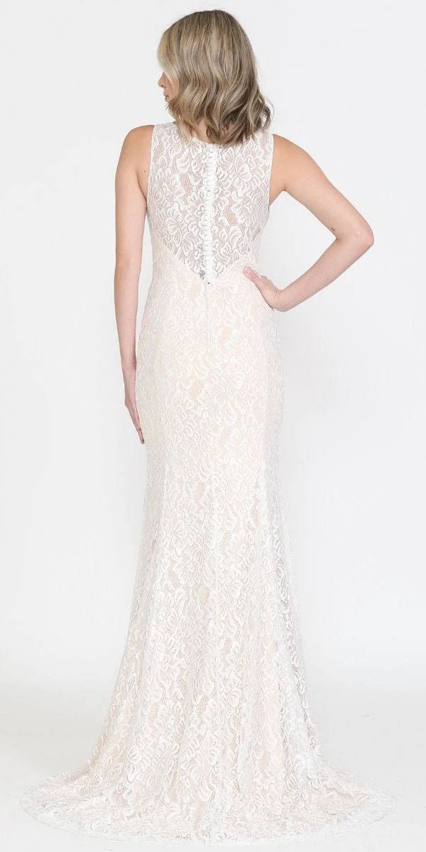 Imagine yourself wearing this beautiful floor length stretch lace dress by Poly USA | Ed Young 8496. This long sleeveless fitted column dress features a V-neckline and closed illusion back. A sophisticated and classic attire for wedding events, awards ceremony or any other formal occasions.