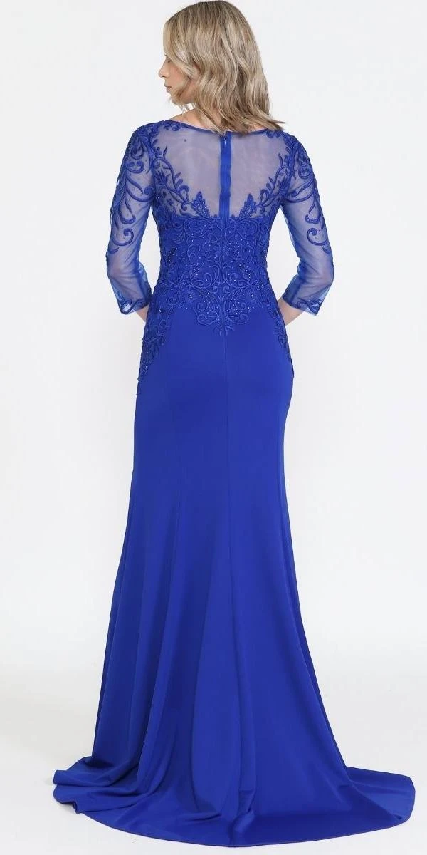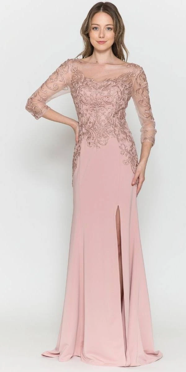 Imagine yourself wearing this beautiful floor length heavy jersey dress by Poly USA | Ed Young 8564. This long mid-length sleeve fitted dress features an embroidered top, bateau illusion neckline, front slit and an open illusion back. A sophisticated and classic attire for wedding events, awards ceremony or any other formal occasions.