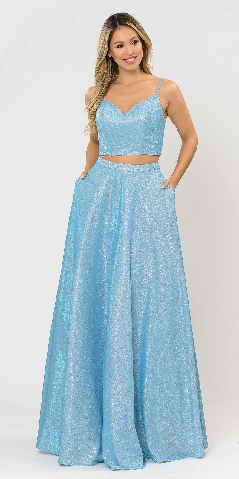 Stand out and shine with this trendy two-piece style ball gown made of glitter knit by Poly USA | Ed Young 8676 in blue. The fitted crop top features a v-shape neckline and lace-up back sustained by a spaghetti straps. An a-line silhouette skirt is added with side pockets that provides convenience. This stunning floor length dress is a flawless outfit for red carpet events, pageant, prom or in any other formal occasions!