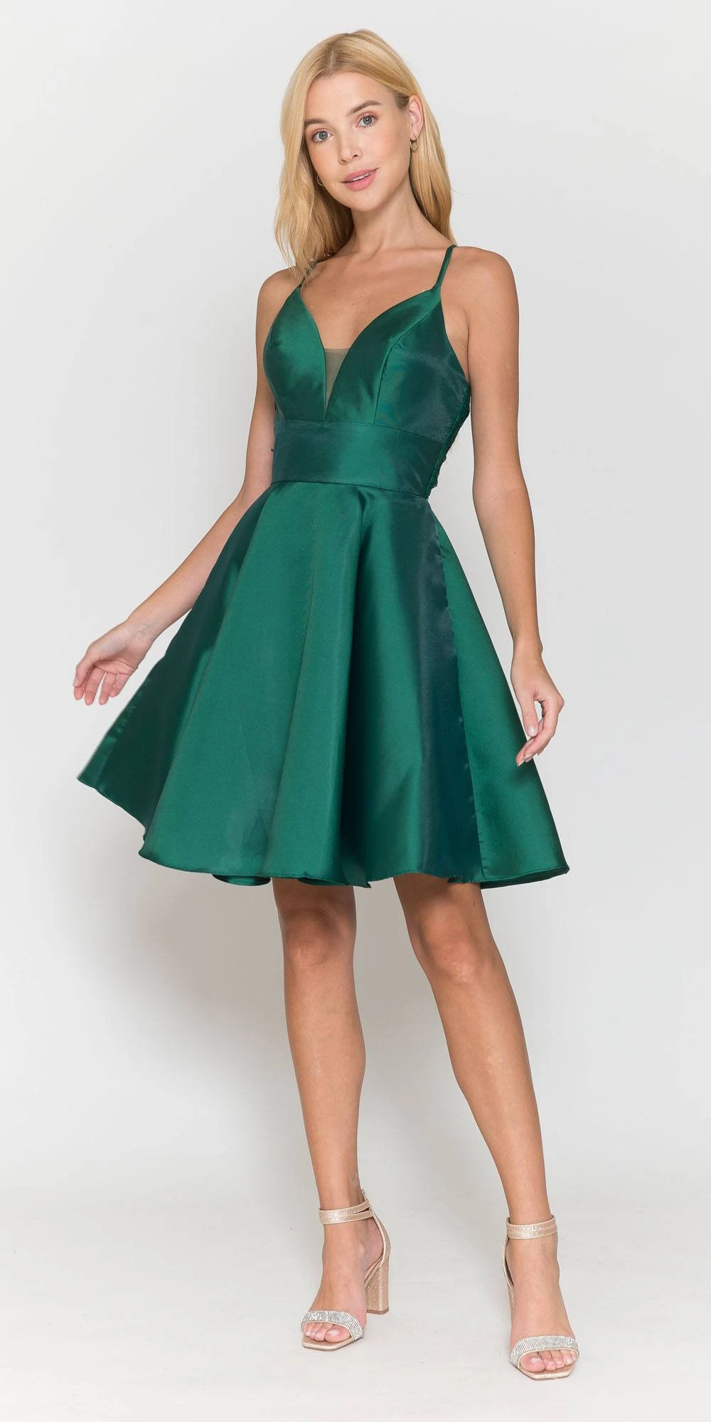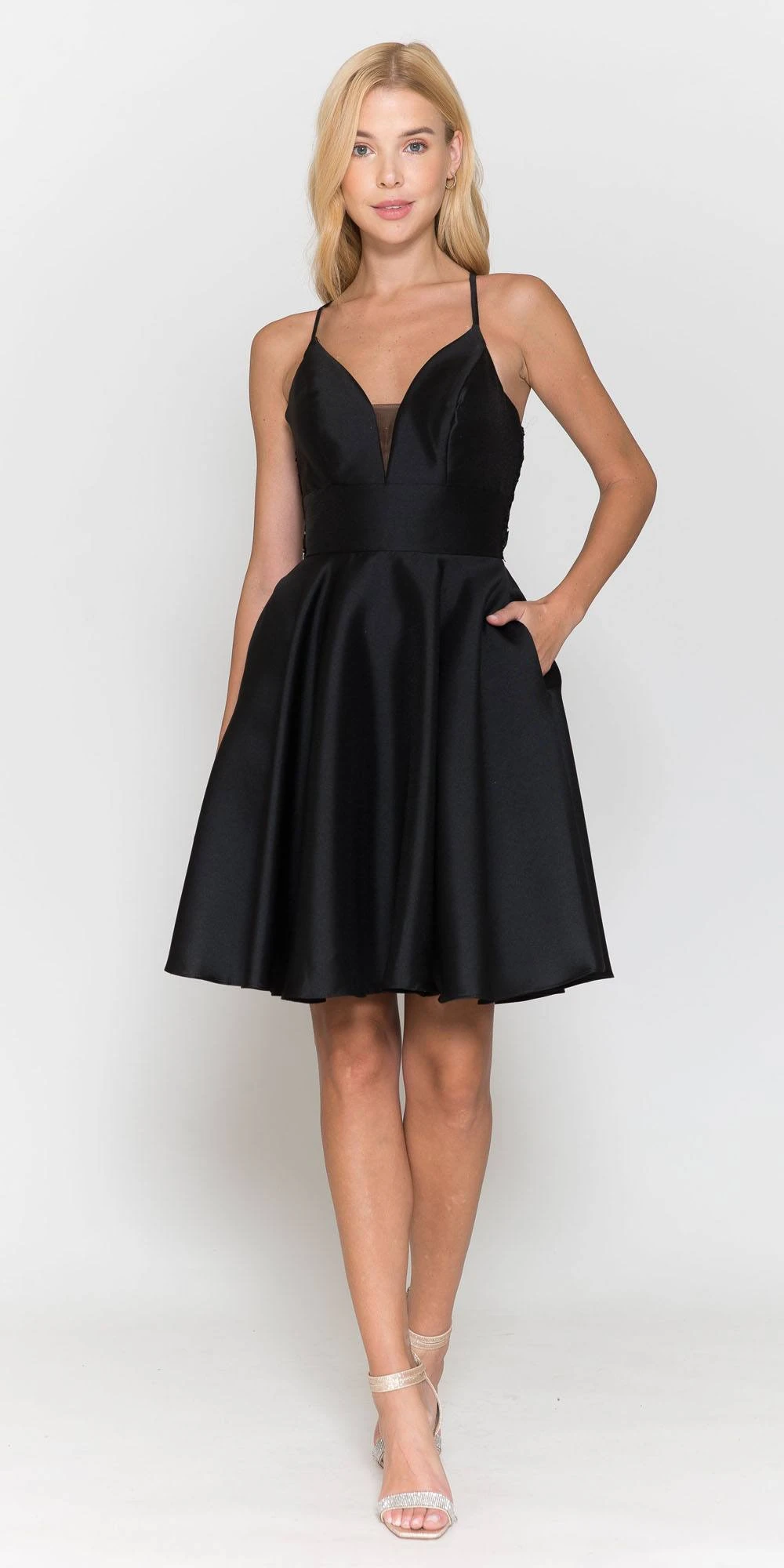 Enjoy the evening in this wonderful A-line short dress for any occasion. A knee length dress by Poly USA | Ed Young 8698 features side pockets with spaghetti straps and a lace covered back. A perfect dress for homecoming, graduation parties or in any other special celebrations.