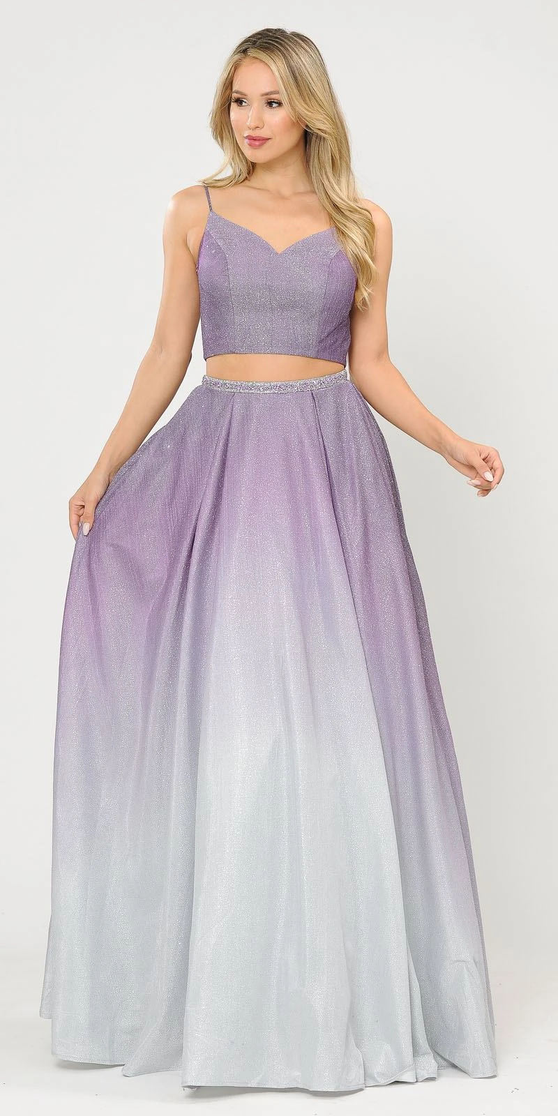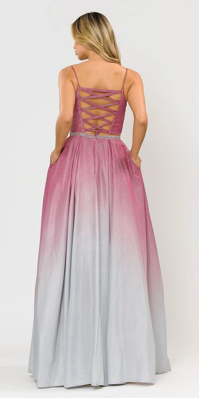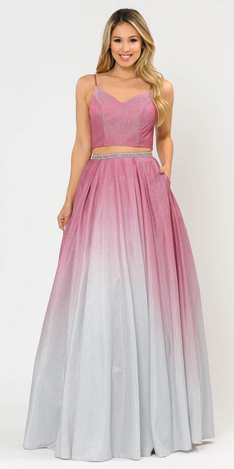 Dazzle in this ombre two-piece ball gown made of glitter knit by Poly USA | Ed Young 8706 in rose. The crop top is sustained by spaghetti straps which feature a v-shape neckline and corset lace-up back. Paired with voluminous skirt with shimmering band wraps around the natural waist. Side pockets adds convenience to this shimmering gown, a perfect outfit for red carpet events, pageant, prom or in any other formal occasions!