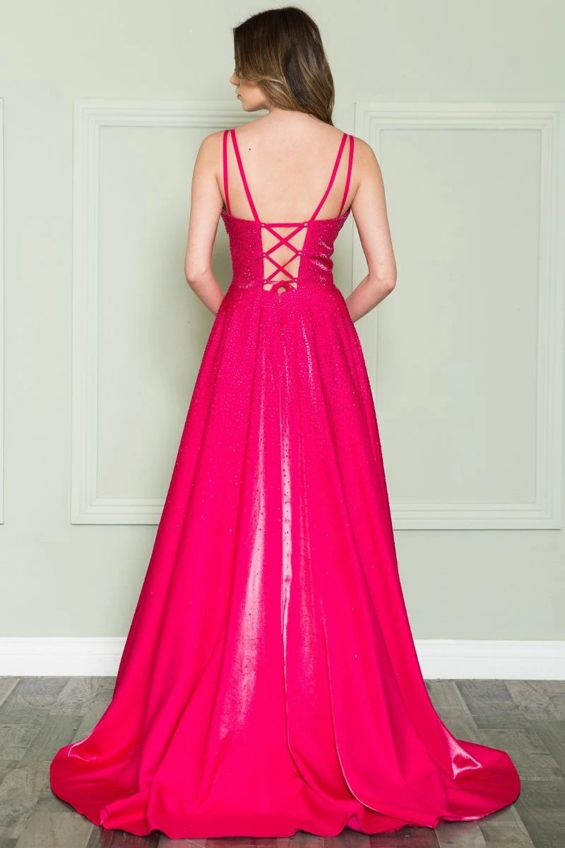 Imagine yourself wearing this beautiful floor-length two-tone shimmer with rhinestones dress by Poly USA | Ed Young 8922. This long A-line gown features side pockets, corset lace up tie back and open leg slit. An ideal full-length dress for red carpet events, pageant, prom or in any other formal occasions!