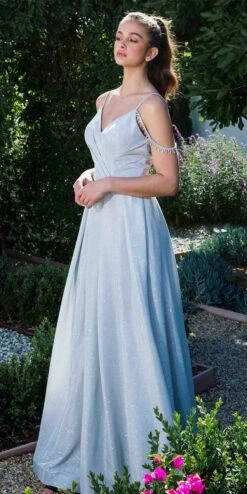 Eureka 9933 Pleated Long Dress V-Neck With Slit(Perry Blue Pleated Long Prom Dress V Neck With Slit)