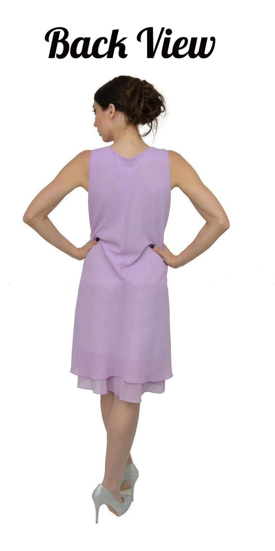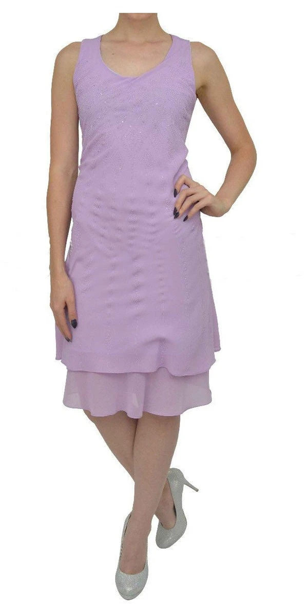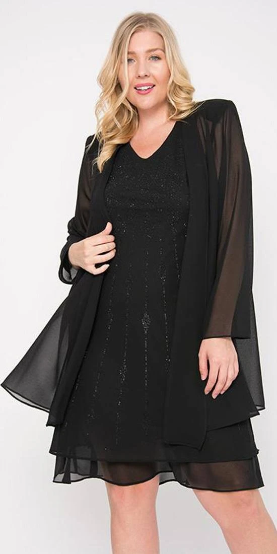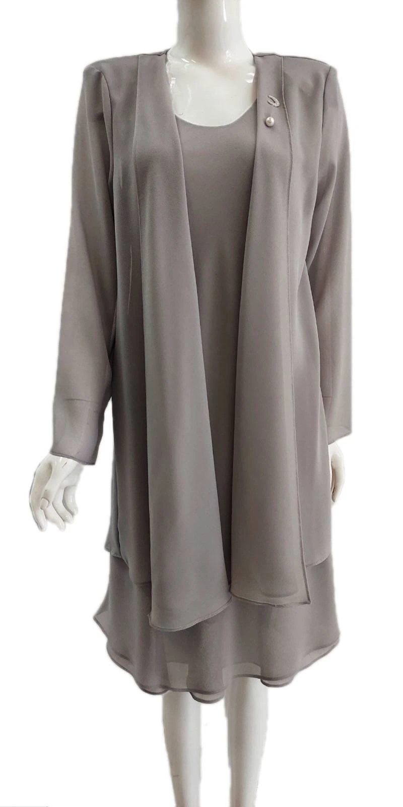 Grab this classy dress and wear it to your next formal occasion. The chiffon georgette fabric flows gracefully from the scoop-neckline. This flowy dress has wide tank straps, is knee length with layered hem. This dress includes a separate matching long sleeve jacket that includes shoulder padding.