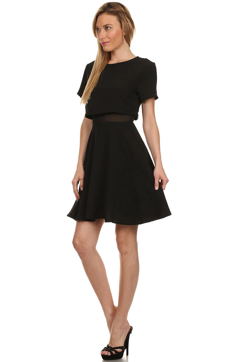 ON SALE! – Solid color, round neckline, short sleeve, mini dress in white with A line fit and mesh inset.