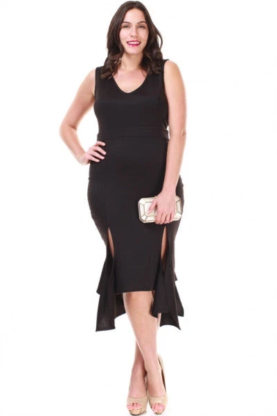 ON SALE – Dress up in this knee length plus size red sheath dress which features a ruffled double slit hem, V neckline and tank straps. Made with 4% spandex for stretch. No zipper.